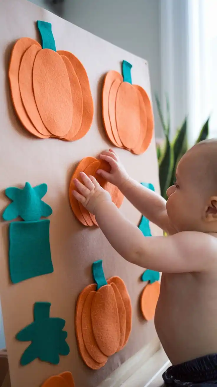 Pumpkin Patch Texture Play is a fun, hands-on craft that introduces babies to different textures while celebrating the season. Using large felt cutouts of pumpkins, stems, and leaves, parents can attach them with Velcro onto a poster board for safe, interactive play. Babies can pull the pumpkins off and stick them back on, creating their own mini pumpkin patch.