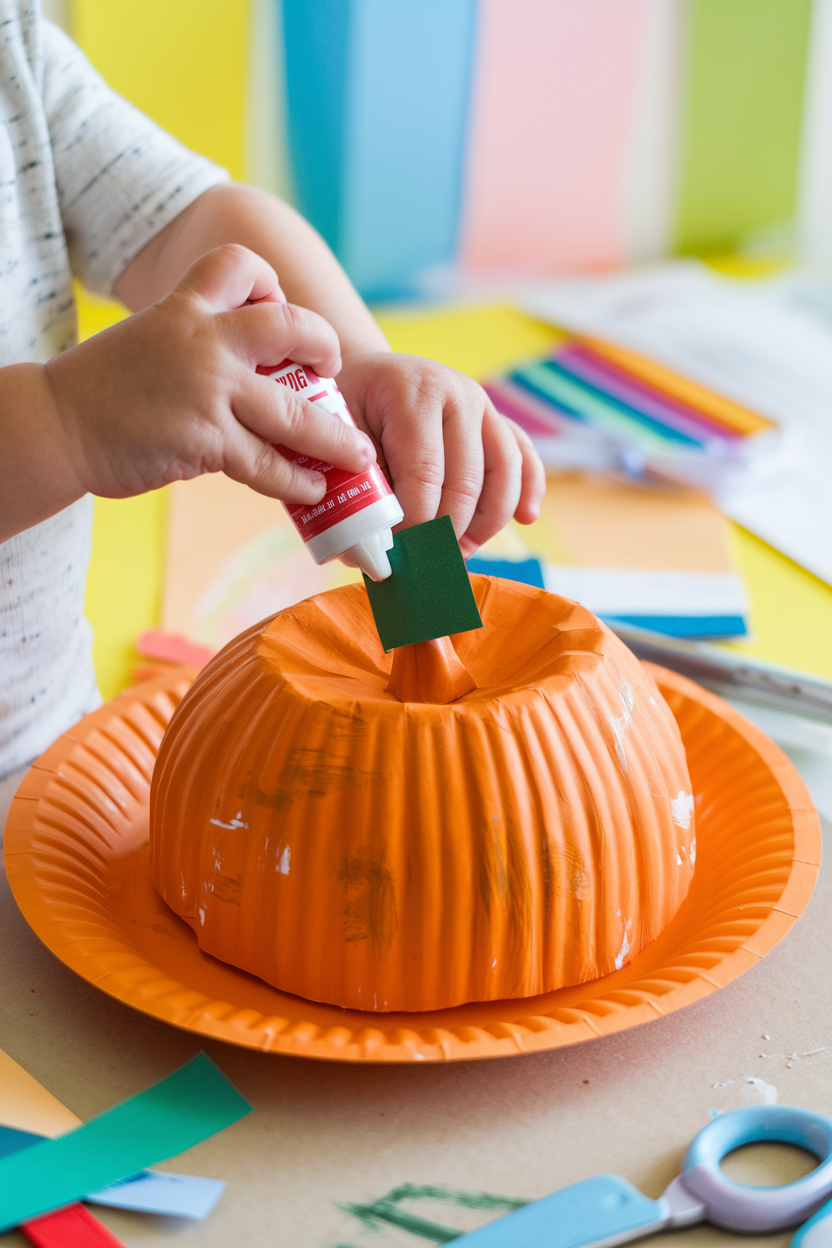 Cut a small rectangle from green construction paper to make the pumpkin’s stem. Help your toddler glue it to the top of the paper plate. For a fun variation, toddlers can crumple a small piece of green paper to create a 3D stem.